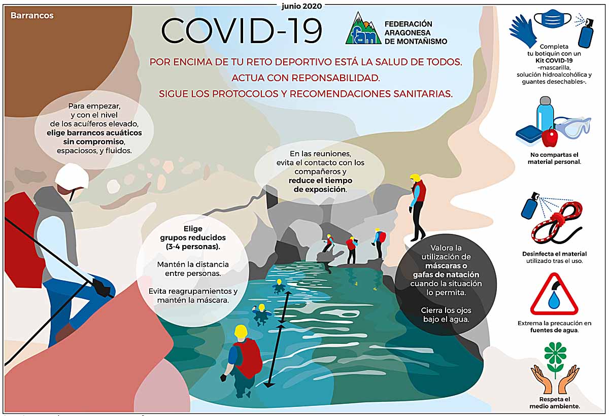 Es tiempo de barrancos pero también de covid-19. Entre las infografías difundida desde la FAM para la práctica segura de los deportes de montaña en tiempos de covid-19 se encuentra esta dedicada a los barrancos.